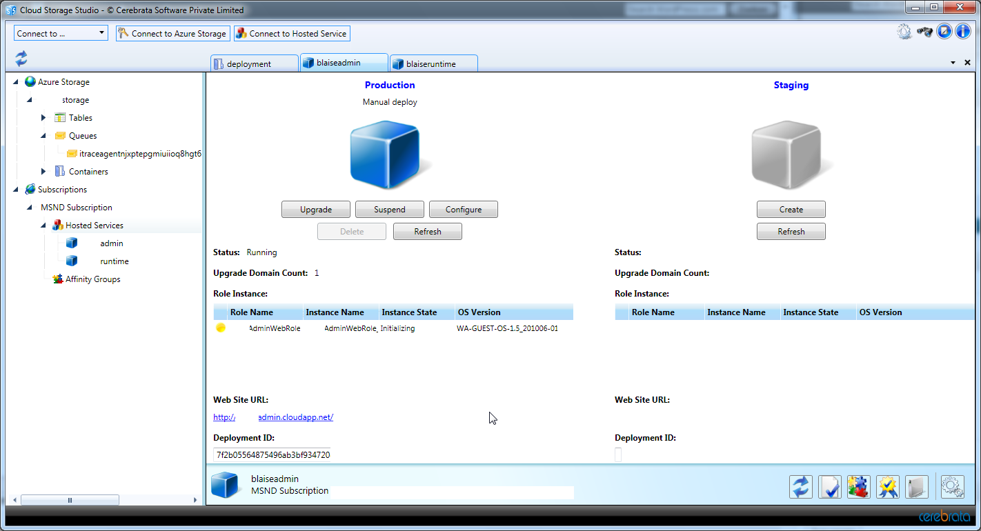 It enables you to manage the cloud services too. After registrating a service account I loaded the certificate from the storage. Loading from the filesystem didn’t work for me. Now I can upload packages, which goes in batches for better performance. The speed difference with VS2010 is noticable. An extra option allows you to start the service as soon as it is uploaded.