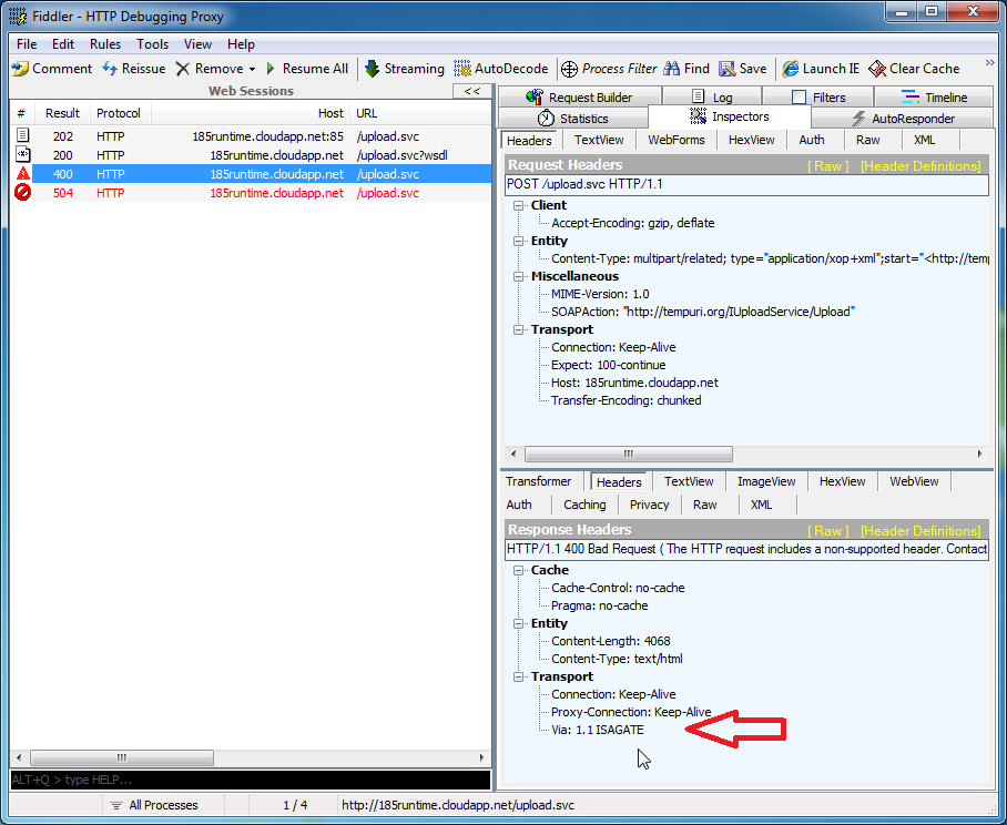Below some screenshots of fiddler (must have) of the blocked port 80 and successfull port 85 session