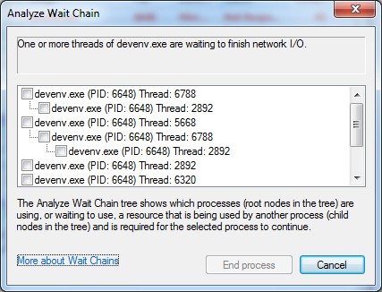 The resource monitor showed the devenv process in red, which meant it was not responding. I already knew that but now I had the option to investigate further. The context menu contains “Analyze Wait Chain” which showed me the threads of the process and why they were not responding: “One or more threads of devenv.exe are waiting to finish network I/O.”. As you can see in the screenshot one thread (2892) is blocking almost every other thread. Would be nice to just kill that thread, but that is not possible. End process will (as the name would suggest) end the complete process and kill all threads.