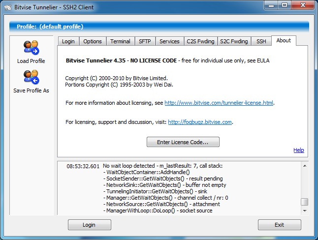 Now I knew where to look. Truns out Tunnelier was spitting out error messages about a No wait loop. Turns out someone else was getting the same error: Bug report. After I upgraded to Tunnelier 4.40 everything runs fine.