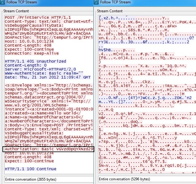 Left the unencrypted messages with the Authorization header in the black box. Right the captured SSL trafic, not actual readble. Conversation is about twice the size though.