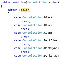 Today I discovered the code snippet with the best timesaving ever: switch. You can use it from the snippet menu (CTRL + K, X)