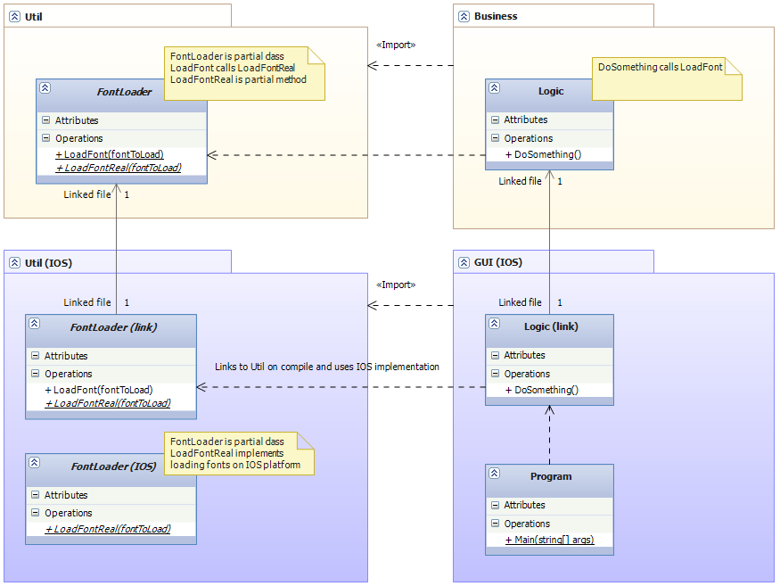 Top left is the partial class FontLoader that is used by the Logic class on the top right. The business project has a reference to the Util project (no linked file) and uses the Util.FontLoader.Load operation in the Business.Logic.DoSomething method.