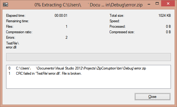 For deployment packages we use DotNetZip Library to create zip files. One of the files recently became corrupted when put in the package.