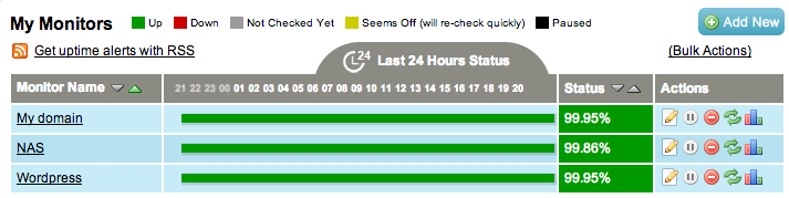 On the My Monitors tab you see the current state of the monitors and the uptime in percentages. I added the monitors after the first post, that is why the uptime is not 100%. uptimerobot my monitors tab