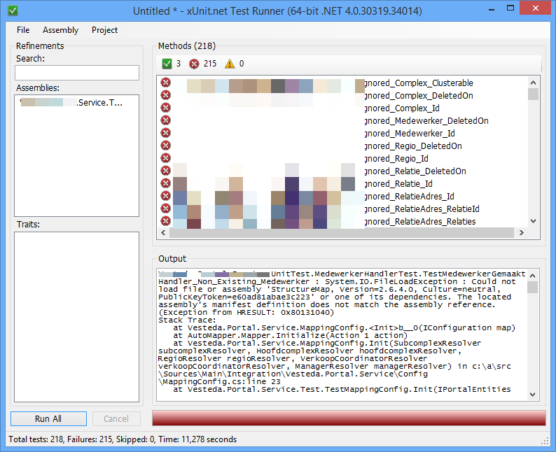 The assemblies are from 10 projects. Apparently the projects use different versions of StructureMap (latest version is incompatible with NServiceBus) and the droplocation contains only one structuremap assembly. This is obviously the wrong version for the unit tests. How about Murphy’s laws 🙂