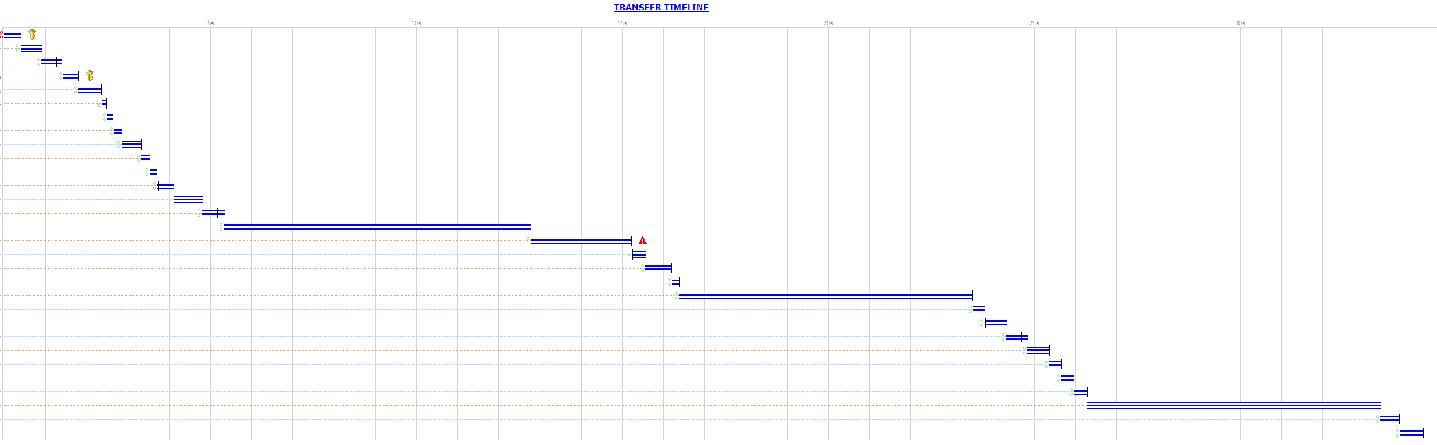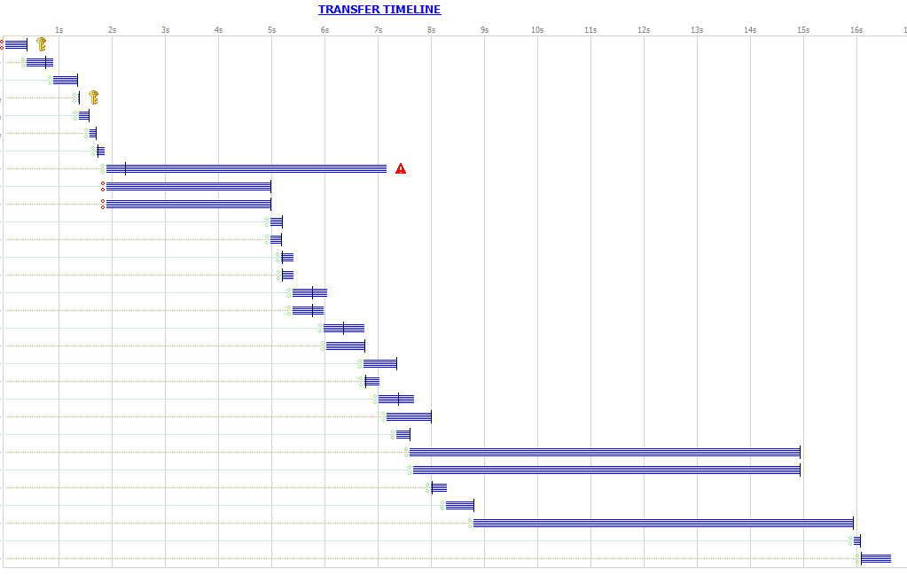 This way we don’t reduce the wait for an offline machine, but make better use of the idle time by doing other requests. The graph below shows the messages captured with fiddler of the same group of machine as the graph above. The total process took 16 seconds in stead of 35.