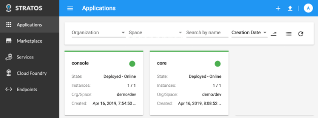 In Stratos the new app is visible. There you can view logging, scale up/down and configure routes.