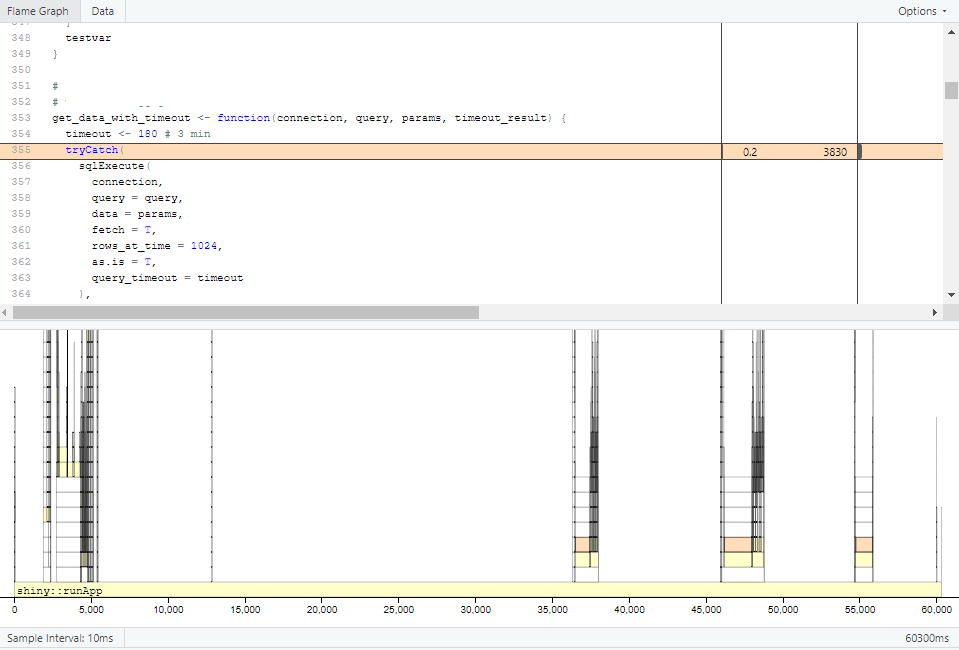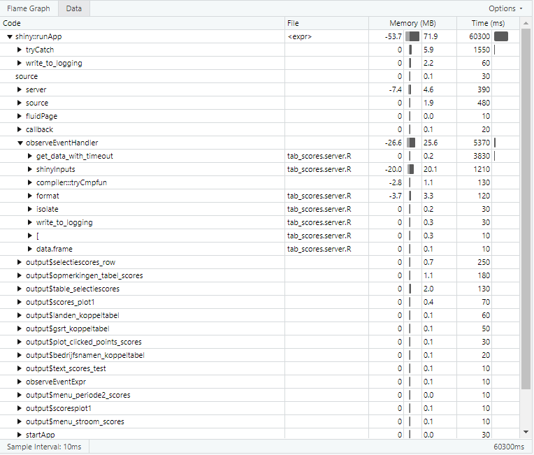 After the R Shiny dashboard starts we followed a test scenario and stopped the app. Then R Studio showed us the profile data in two tabs (images below). One tab with a flame graph so you can see the spikes in (wait) time / memory during the test scenario. The other tab shows the same data in a table per file / function.