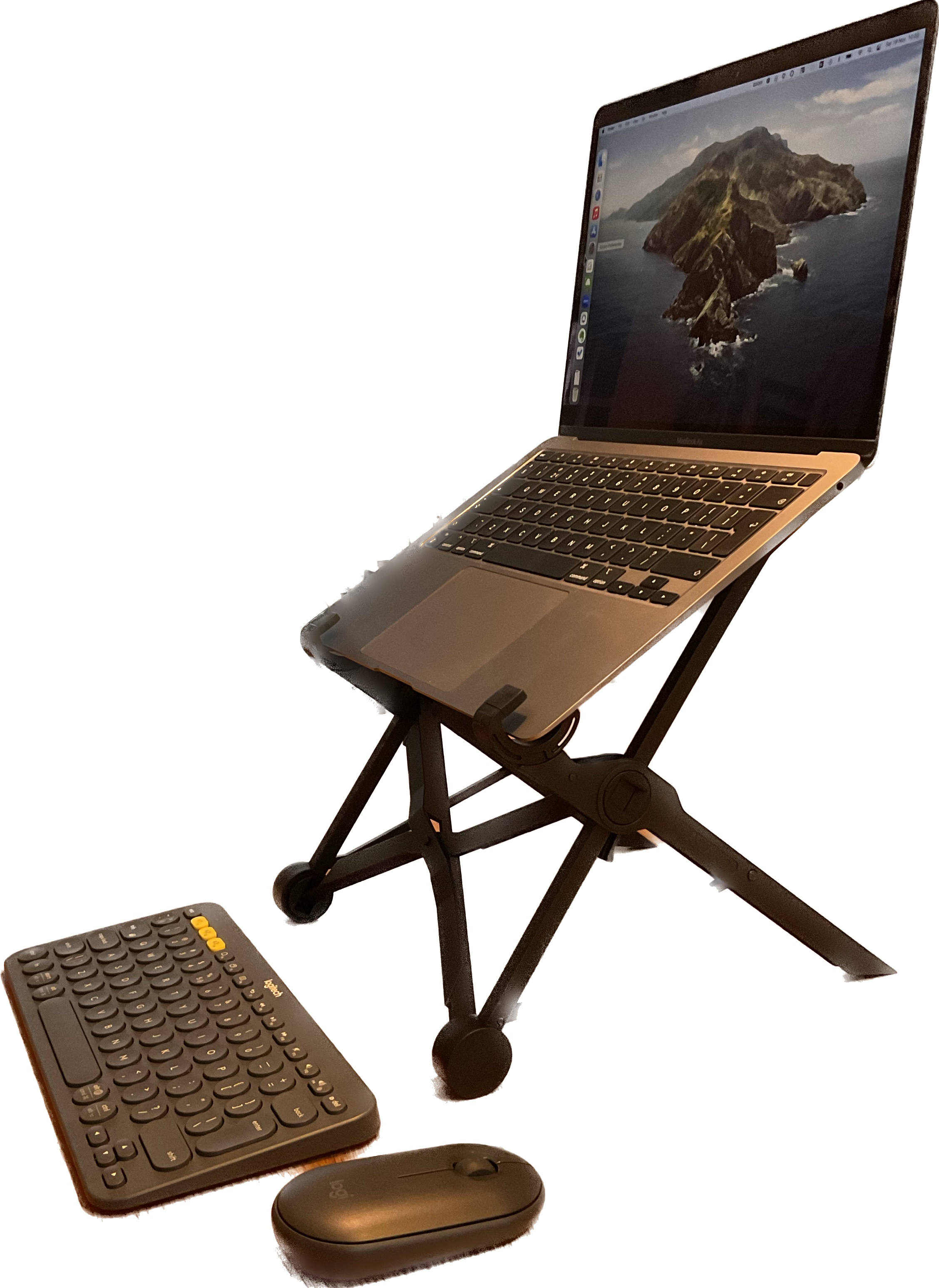I’m working on a laptop for some time now. When I work in my home office I can hook up an external monitor and full size keyboard/mouse. When I work on the go like in the library or coffeeshop I use the nextstand and the Logitech K380/pebble.